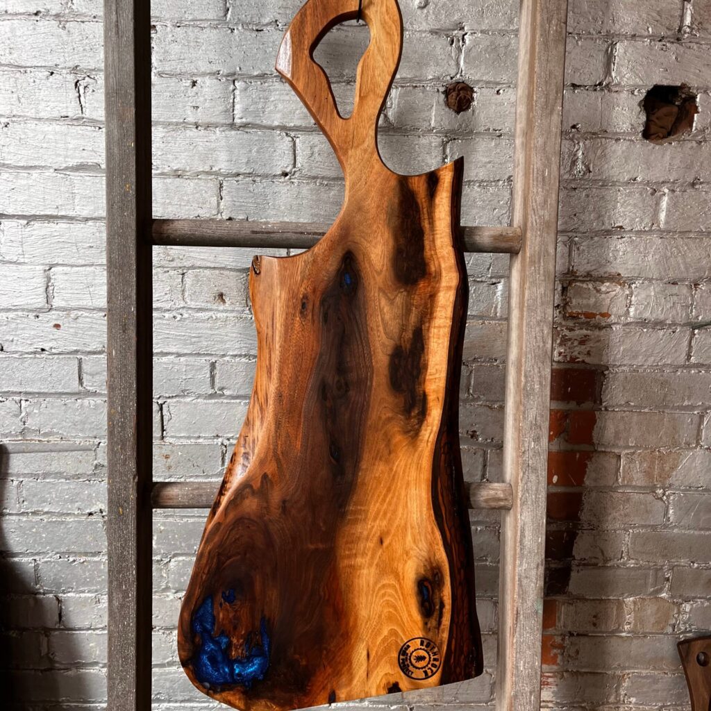 To add a more personal touch to the items, Hildebrand lasers the GPS coordinates of the original standing tree into each table he makes. On the charcuterie boards, he includes the GPS coordinates along with the type of wood and where it came from on the hang tags of the handle.