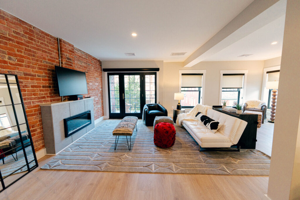 Living room areas are accented by brick and studs from the original building — “It was a nice discovery,” Brown says — but the doors and insulated windows are all new, for example. The building now has air conditioning and new wiring throughout. Guest-specific keyless entry and camera monitoring outside the building and in the parking lot provide a sense of security.