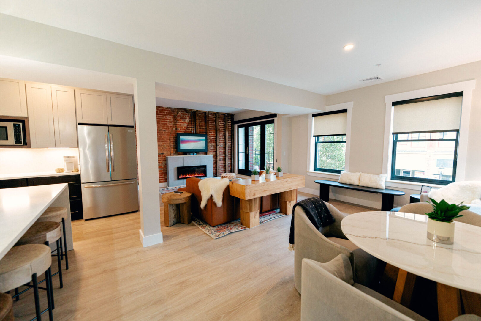 Living room areas are accented by brick and studs from the original building — “It was a nice discovery,” Brown says — but the doors and insulated windows are all new, for example. The building now has air conditioning and new wiring throughout. Guest-specific keyless entry and camera monitoring outside the building and in the parking lot provide a sense of security.