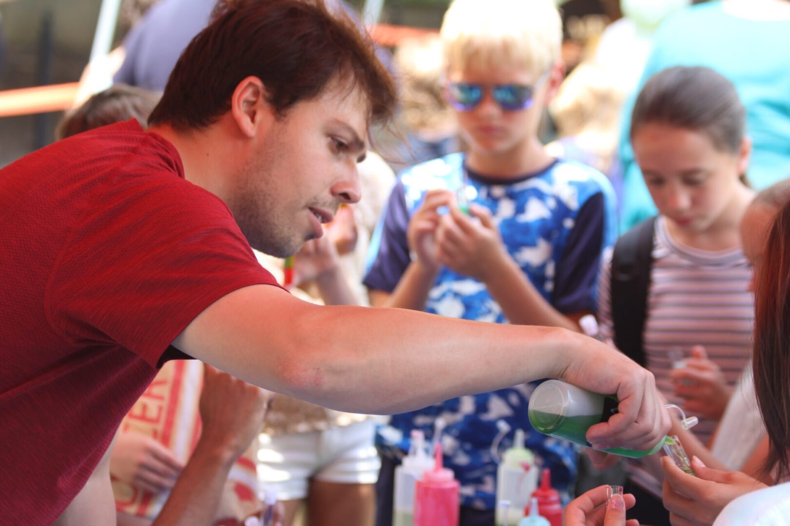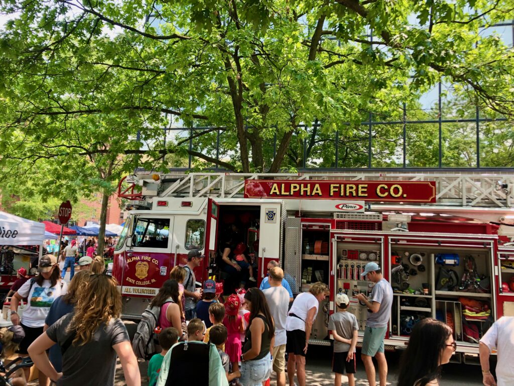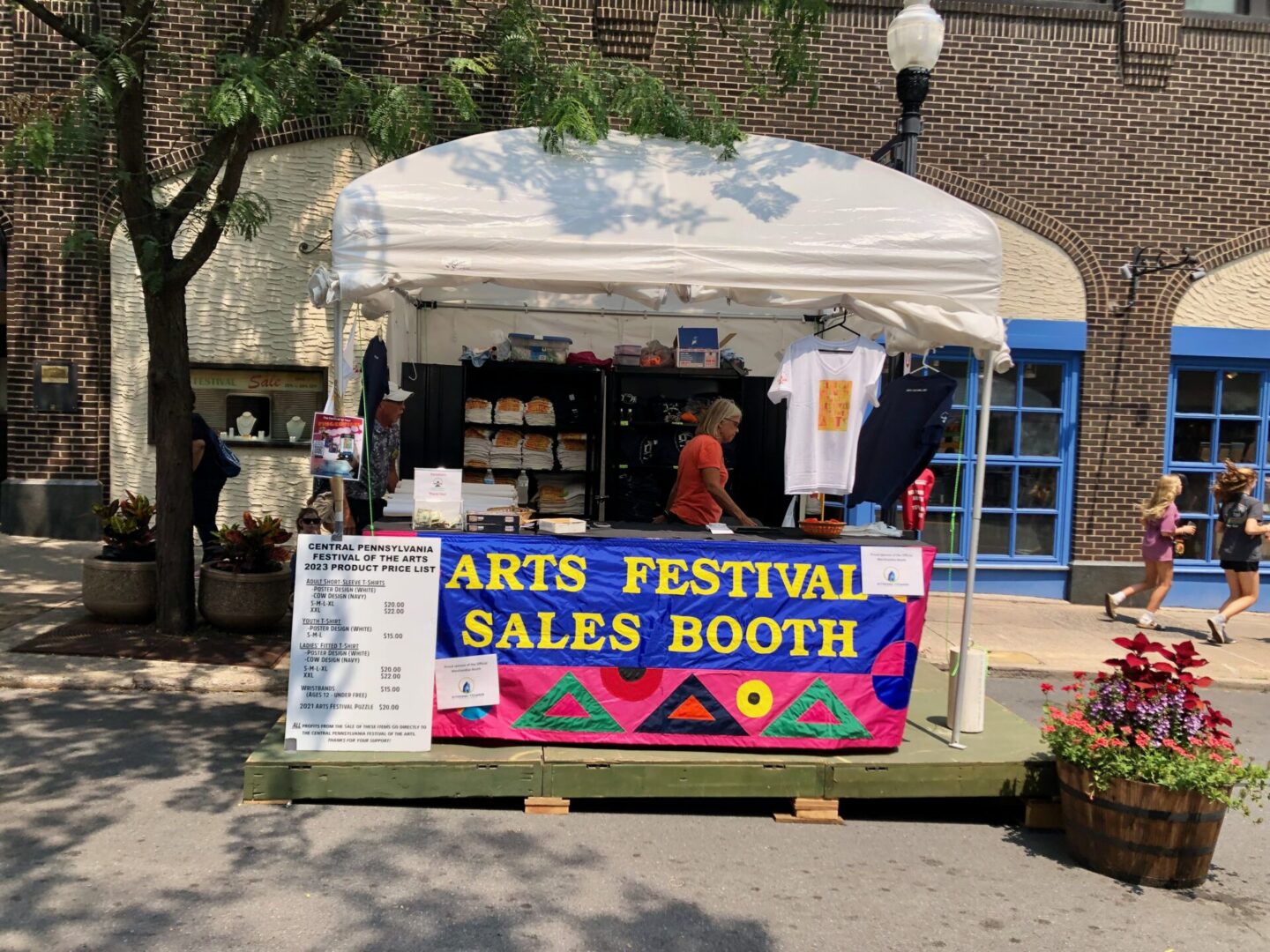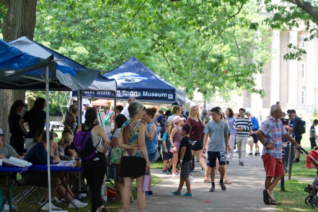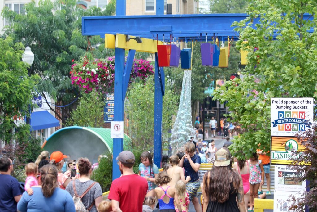 The misting tunnel and dumping buckets on South Allen Street offer a way to stay cool on hot days at the festival. Photos by Geoff Rushton | StateCollege.comSales and information booths can be found near the intersection of South Allen Street and College Avenue. Photos by Geoff Rushton | StateCollege.comStaff at the Chan’s Golden Gate stand serve up French fries (left). Festival-goers wait in line for shaved ice (right). Photos by Geoff Rushton | StateCollege.comCrowds make their way through the Children and Youth Sidewalk Sale on South Allen Street. Photo by Geoff Rushton | StateCollege.comFrom left, Rhenleigh Weikel, Miri McLeod and Claire and Ellie Roy were among the first-time participants in the Children and Youth Sidewalk Sale. Photos by Geoff Rushton | StateCollege.comA festival-record 280 young artists and crafters showcased their work in the Children and Youth Sidewalk Sale. Photos by Geoff Rushton | StateCollege.comMusic with Papa brought an entertaining and educational performance to the Allen Street stage (left). Centre County Recycling and Refuse Authority and Jabebo Studio offered activities to learn about recycling. Photos by Geoff Rushton | StateCollege.comAlpha Fire Company gave youngsters a chance to explore a ladder truck, while State College police officers Craig Bernier and Kelly Aston made buttons for kids. Photos by Geoff Rushton | StateCollege.comPenn State hosted scientific and creative activities on Old Main Lawn during Arts Festival’s Children and Youth Day. Photos by Geoff Rushton | StateCollege.com