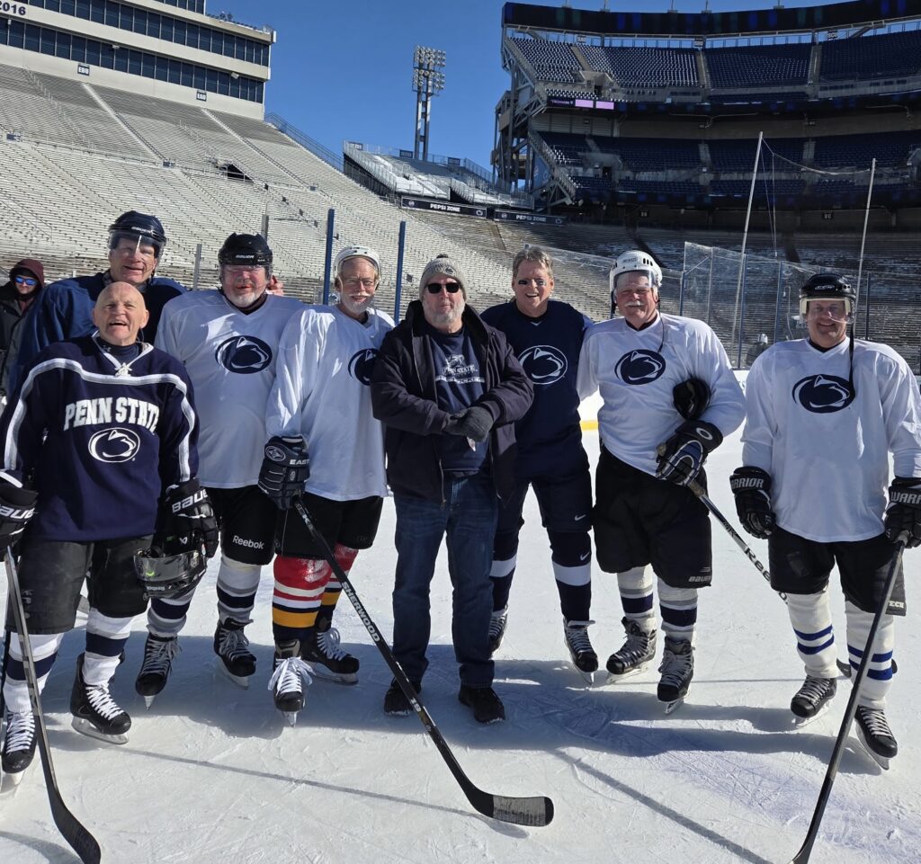 On Sunday the alumni game and family skate took place on the outdoor rink inside Beaver Stadium. As I walked out of that same south tunnel where I had seen Coach Paterno almost 50 year earlier, I got goosebumps and tears in my eyes. Joy, pure joy, in the eyes of more than 90 alumni who participated whether it was the young varsity alums or the older Icer alums. There is just a purity to playing hockey outdoors. As guys were going off the ice, they were ringing the Beaver Stadium victory bell, telling the same old stories (mostly embellished) in the football team’s locker room, and there were hugs all around.