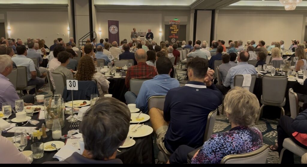Our speaker was a return guest, Ted Scott, caddie for world No. 1 golfer Scottie Scheffler since 2021 after caddying for 15 years for two-time Masters Champion Bubba Watson. A crowd of over 400 had gathered to listen to worship music before Rick Reichel from the Heritage Classic Foundation, which financially supports our South Coastal FCA chapter, gave a few brief remarks. He talked about the importance of Community, Character, Caring, Camaraderie and Competition, all for Christ.