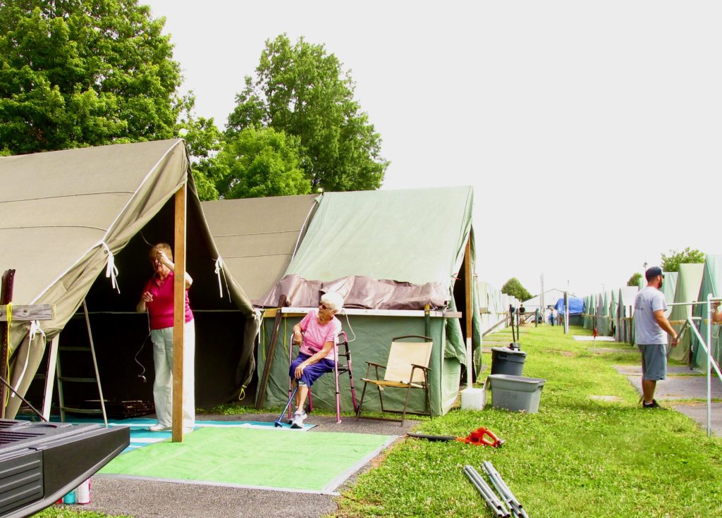 Sunday was a day for tenters to set up before the fair officially opens on Aug. 20. In the tent area, pickup trucks, SUVs and utility trailers were seen in every row, and the sounds of drills, hammers and leaf blowers were heard as tenters assembled front porches and rear kitchen add-ons for their tents, and cleaned up leaves and debris from the tent platforms. The add-ons are mostly wooden, plastic pipe or metal tube-framed and are covered with plastic tarps.