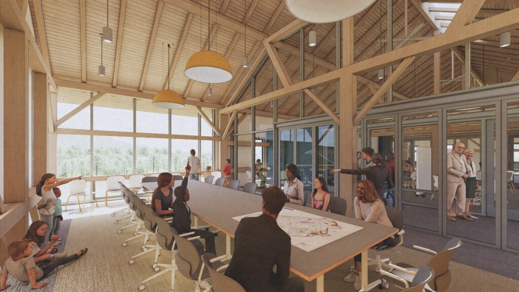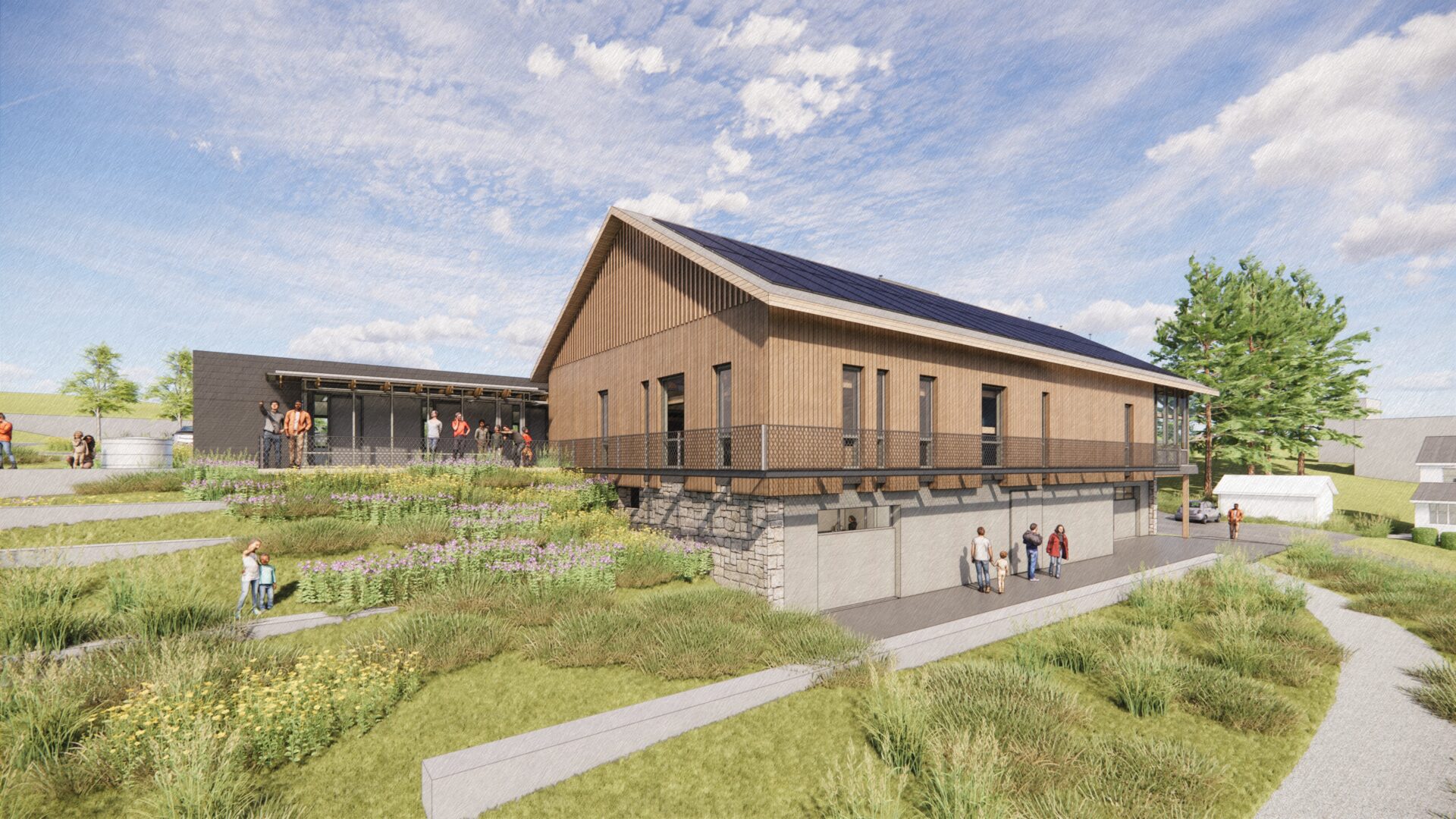 The center will also utilize solar panels, geothermal systems, and landscaping that incorporates original stone foundations will complement the timber-framed barn structure.
