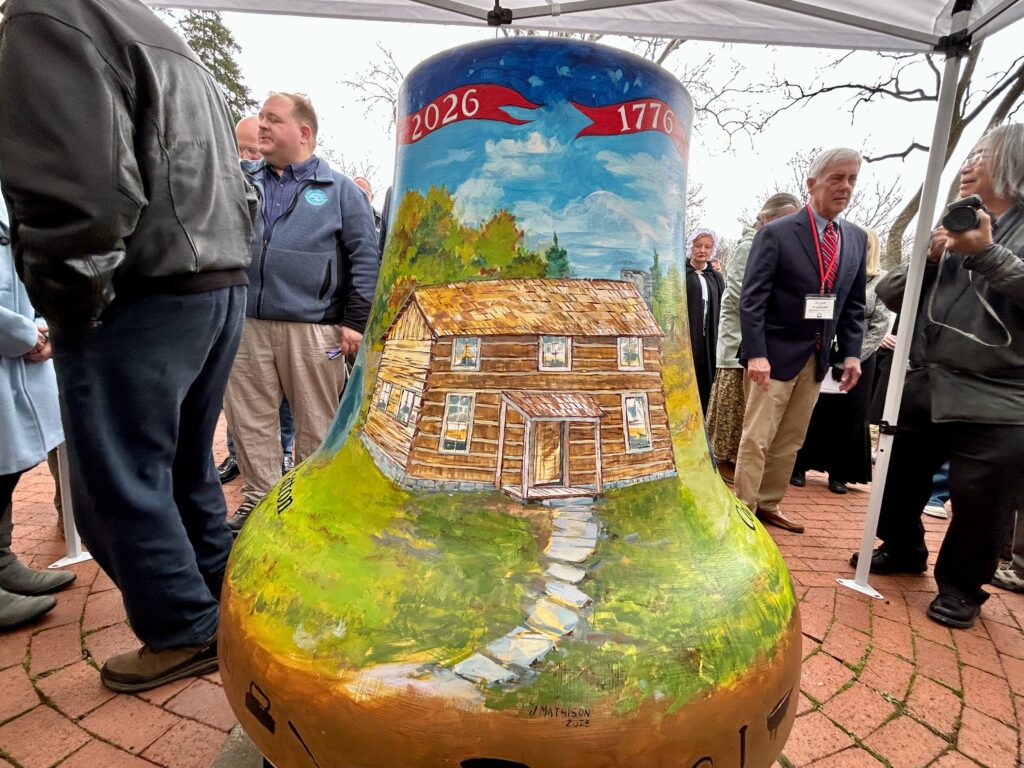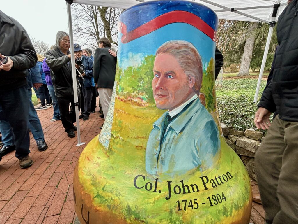 Working for weeks in a temporary studio at the mansion, Mathison painted the bell with the original two-story log house that stood on the site, Centre Furnace founders and Revolutionary War veterans Samuel Miles and Patton, and the furnace stack, which stands across Porter Road from the mansion as an artifact of the county’s history.