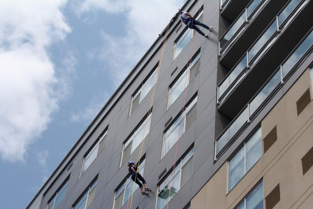 More than 20 people rappelled 155 feet down the side of a downtown State College high-rise on Tuesday to help their fellow community members.