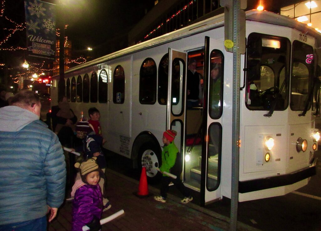 Downtown State College Improvement District‘s monthly celebration of local businesses, art, food and entertainment took on a seasonal flair for its final edition of the year. At the Martin Luther King Jr. Plaza, Santa visited with the young and young at heart, families made ornaments at The Makery and free trolley rides offered trips around downtown.