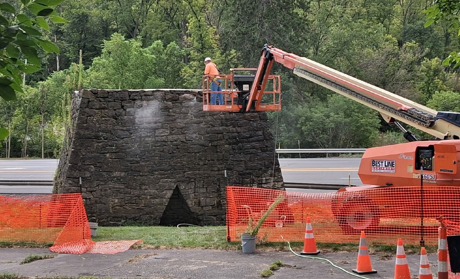 “The 1963 restoration of the furnace stack has endured for six decades,” Mary Sorensen, CCHS executive director, said. “The stack consists of dolomic limestone, which is a very hard, less absorbent stone as compared with others. Luckily, we inherited a stack that now needs only a mild cleaning, spot repointing of cracked masonry joints, and an elastomeric coating on the top to seal it from water damage.”