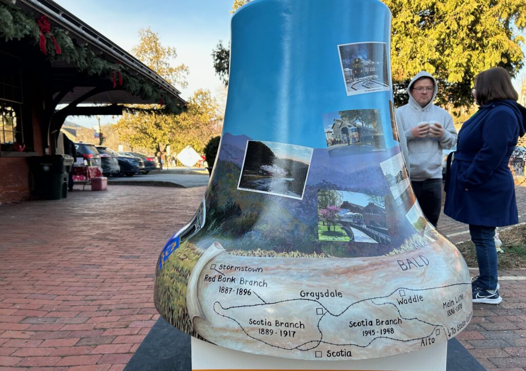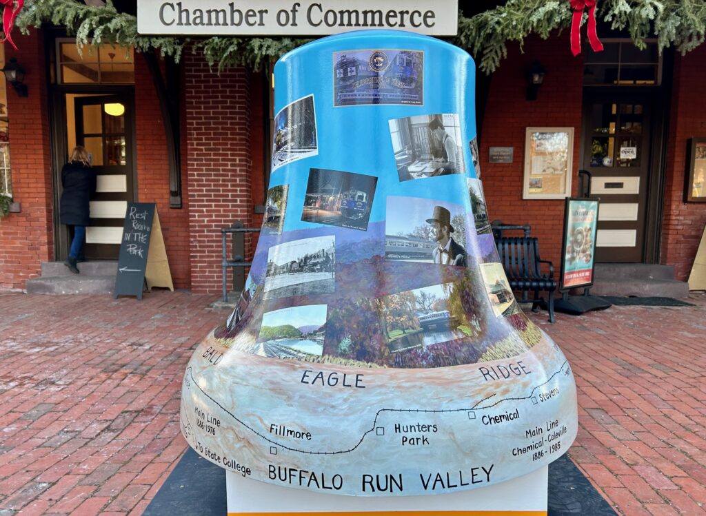 The 3-foot-by-3-foot fiberglass bell designed by local artists Holly Foy and James Farrah depicts images from the area’s railroad history and is located outside the Bellefonte Historical Railroad Society’s headquarters at the train station in Talleyrand Park.