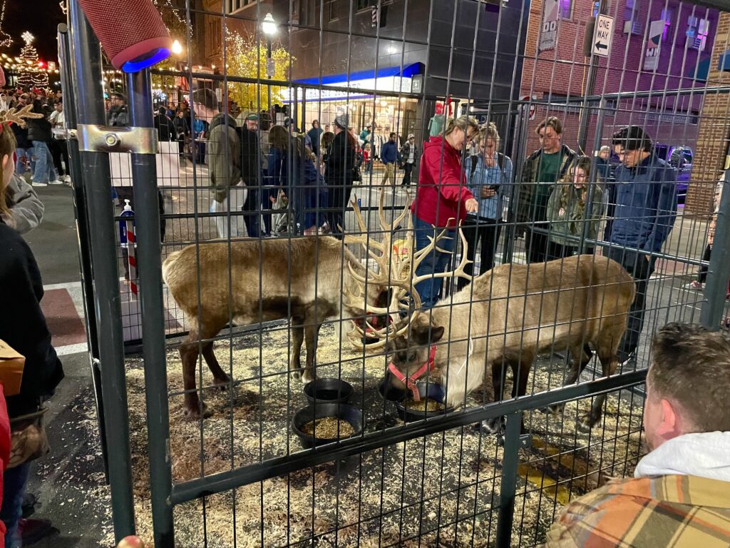 Light Up Night culminated with the lighting of the tree at the Allen Street Gates. Photo by Andrea Robinson | For StateCollege.comNew to Light Up Night for 2023 was a winter market on South Allen Street. Photos by Andrea Robinson | For StateCollege.comAlso new for this year were live reindeer on South Allen Street, sponsored by Growing Tree Toys, Lion’s Pride and Harper’s. Photo by Andrea Robinson | For StateCollege.comThe YMCA of Centre County’s Travelin’ Table was among the food offerings during Light Up Night. Photo by Andrea Robinson | For StateCollege.comMary Rose Valentine of Tempest Productions was among the street performers on Allen Street during Light Up Night. Photo by Andrea Robinson | For StateCollege.comMonster D was on hand at Light Up Night creating his unique drawings. Photo by Andrea Robinson | For StateCollege.comFree trolley rides around downtown were available throughout the evening. Trolley rides will be offered again leaving from the MLK Plaza on South Fraser Street 5 to 8 p.m. on Dec. 1, 11 a.m. to 2 p.m. on Dec. 2, 5 to 8 p.m. on Dec. 8 and 11 a.m. to 2 p.m. on Dec. 9. Photo by Andrea Robinson | For StateCollege.comLight Up Night featured the debut of the timed holiday light show in MLK Plaza. The light show will be on display 5 to 10 p.m. nightly through Jan. 1. Photos by Andrea Robinson | For StateCollege.comThis year’s Christmas tree in downtown State College was donated by Highland Holding Group from a property on D Alley.Photo by Andrea Robinson | For StateCollege.com