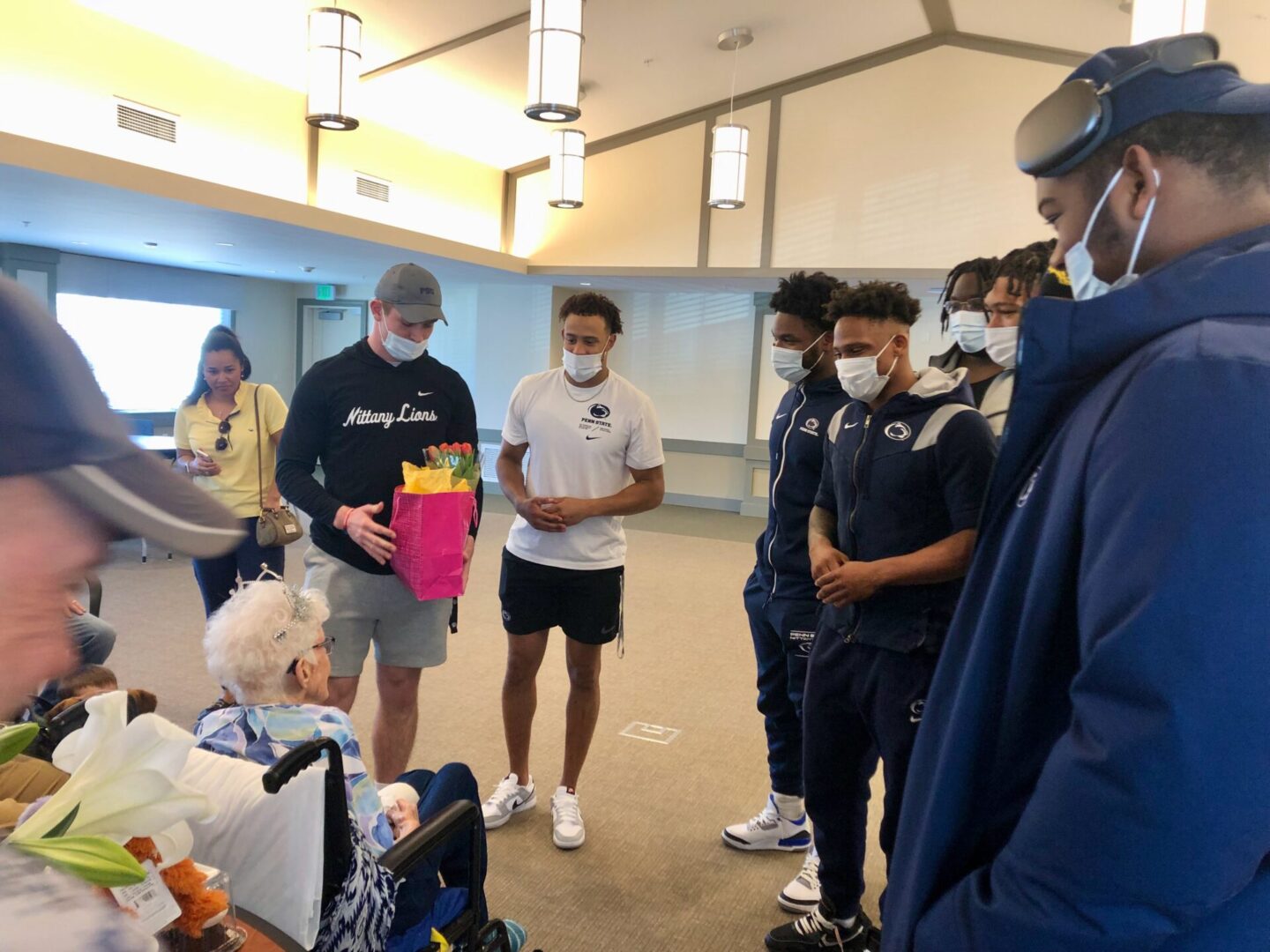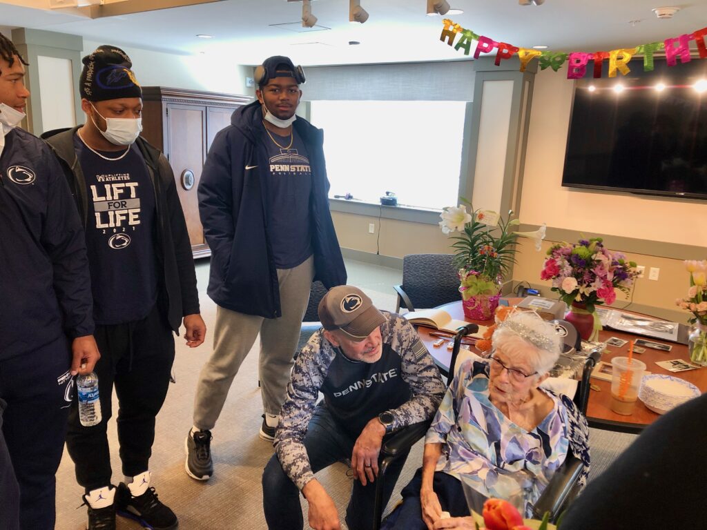 Eight Nittany Lion football players joined DeWolfe’s family and friends to celebrate her birthday at Centre Care, the nonprofit nursing facility in College Township.