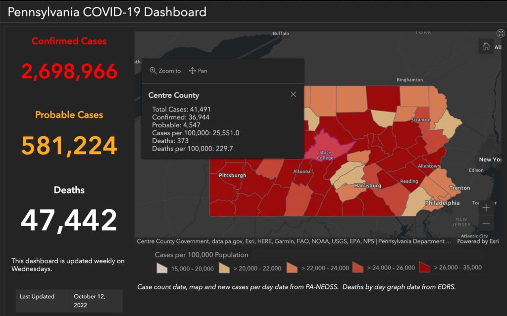 Pennsylvania and Centre County COVID-19 dashboard for Oct. 12, 2022. Image via Pennsylvania Department of Health.