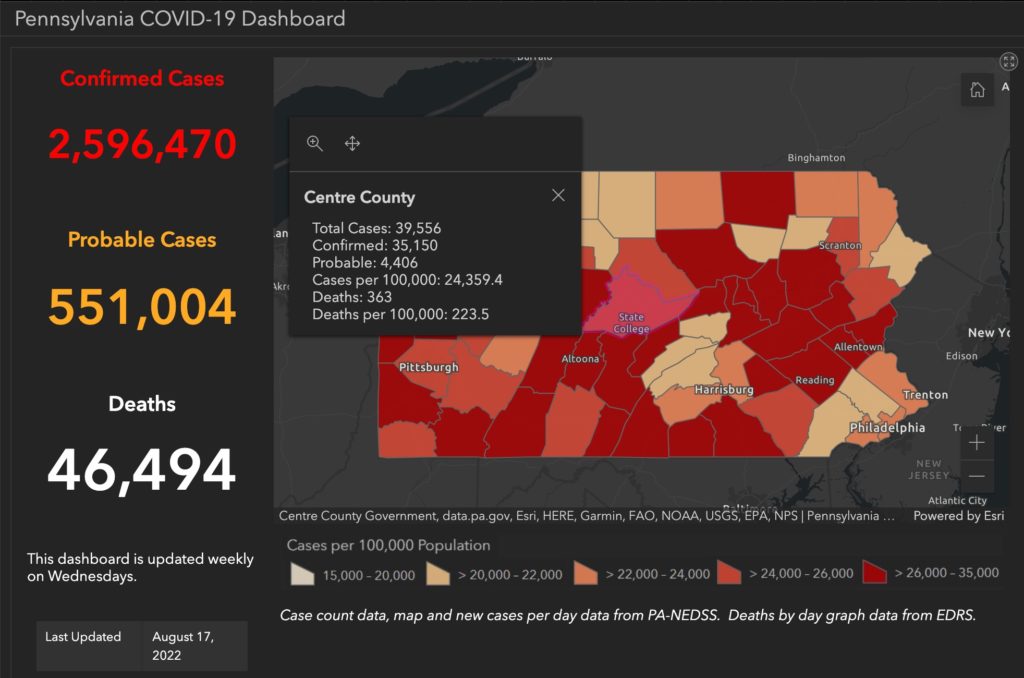 Centre County’s PCR testing positivity rate for the week of Aug. 10-16 was 18%, up from 17% the previous seven days, according to the DOH early warning monitoring dashboard. The rate was the 33rd lowest among Pennsylvania’s 67 counties.