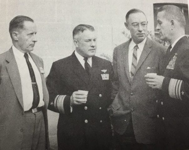 Penn State President Eric Walker (second from right) meets with Navy officers at a water tunnel reception in the decade following its completion. Image: Penn State University Archives