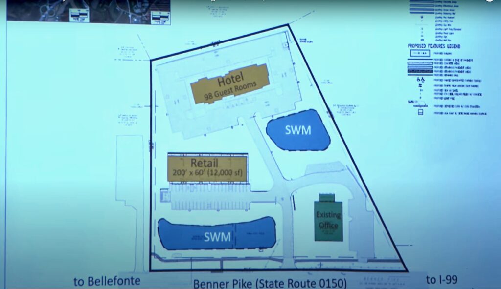 At the Amberleigh Lane and Benner Pike intersection, property owner SAI 21 LLC plans to develop an unnamed 107-room hotel, and the subdivided property will also include a car wash.