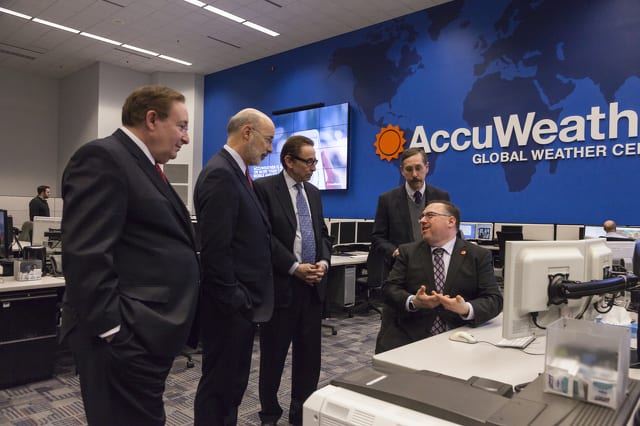 President and Chairman Joel Myers, who welcomed Wolf on the tour, founded AccuWeather as a consulting business in 1962 when he was a graduate student in meteorology. Its global headquarters have remained in the State College area as AccuWeather has grown to become the largest source of weather forecasts and warnings and a leader in digital media for weather.