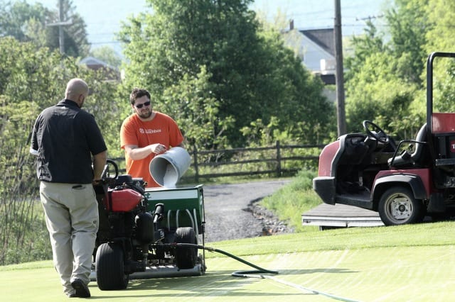 Phospholutions COO Ben Nason pours Rhizosorb into a spreader as it is applied to a green at the Penn State White Course on Thursday. Photo: Geoff Rushton/StateCollege.com