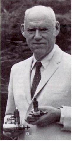 Bill Brown holds two of his Brown Junior model airplane engines. They were the first practical gasoline-powered model aircraft engines ever made.