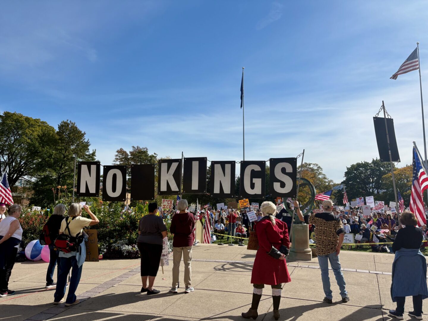 A crowd that organizers estimated at 3,000 people attended the second No Kings rally in State College in October, when millions participated in similar protests nationwide. That event began on Old Main Lawn and included a march through downtown State College.