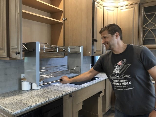 It’s hard to reach the top shelf when you are in a wheelchair, so Trevor Tamsen from the Stephen Siller Tunnel to Towers Foundation shows how the nonprofit custom built a home for disabled veteran Adam Hartswick with accessible shelves that fold down. Other smart features include a mechanized lift that allows the stove to be raised and lowered to wheelchair height, customized bathrooms and automated doors and security. Photo by Vincent Corso