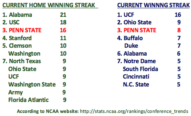 BTW, the Nittany Lions also own the nation’s No. 3 current home winning streak, at 16 straight in Beaver Stadium. Alabama is first, with 21 consecutive homefield wins, followed by USC, with 18.