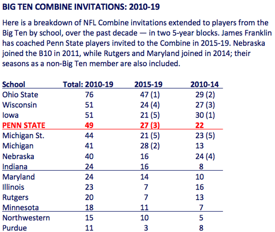 Nationally from 2015-19, Penn State barely squeaks into the Top 20 for Combine participants. Alabama, with 55, ranks first, followed by Ohio State (47), Clemson (40) and Florida (39).