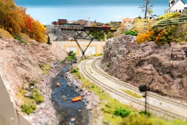 Perhaps the most impressive part of the layout is the landscaping. The rock walls and mountains you see were all hand-carved from plaster and hand-painted by members of the club. For the smaller foliage like grass and bushes, the club uses colored foam to create the right texture. The water, which looks incredibly realistic, is made of melted plastic beads and poured into place to harden.