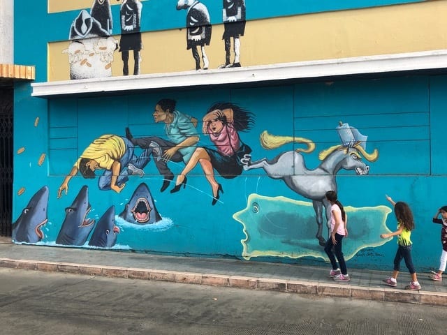 From Yauco we drove to Ponce, where the rest of our group – we’re 18 students and four journalism faculty members – were watching the Mardi Gras parade. While we waited for them to straggle back to the bus we’d rented for the day, we admired an array of murals and one lurid sculpture that made clear that Puerto Ricans, or at least Puerto Rican street artists in Ponce, had not forgotten President Trump’s let-them-sop-up-the-hurricane-with-paper-towels moment.