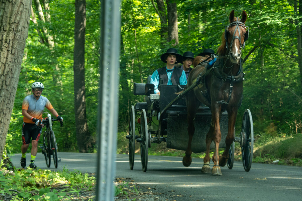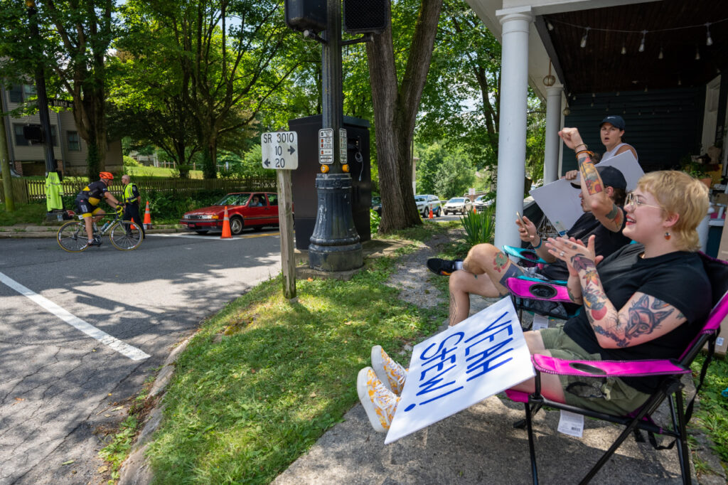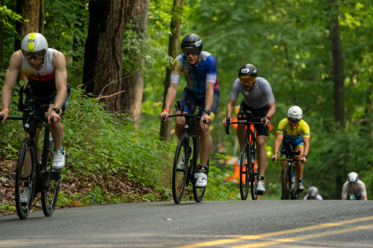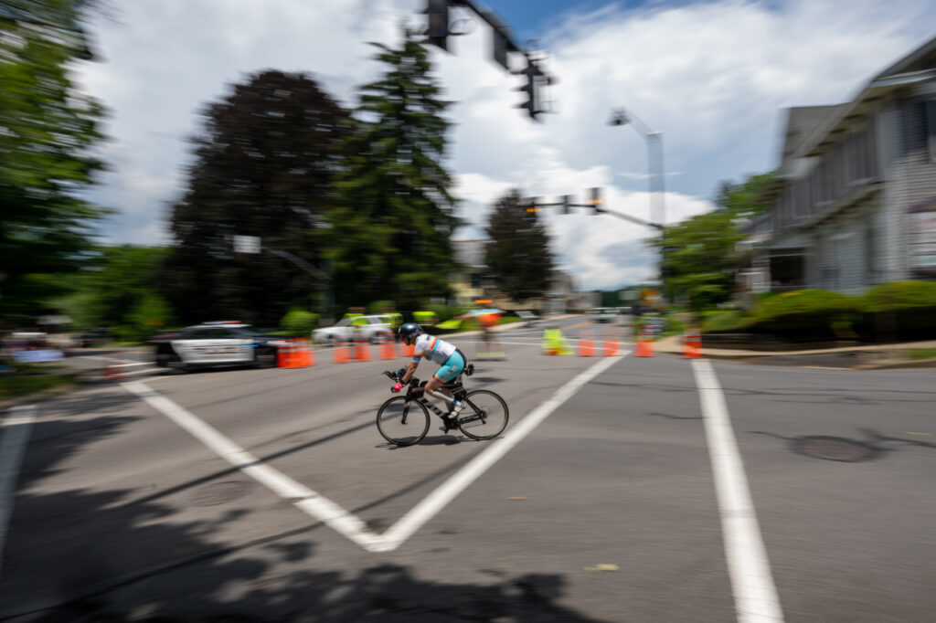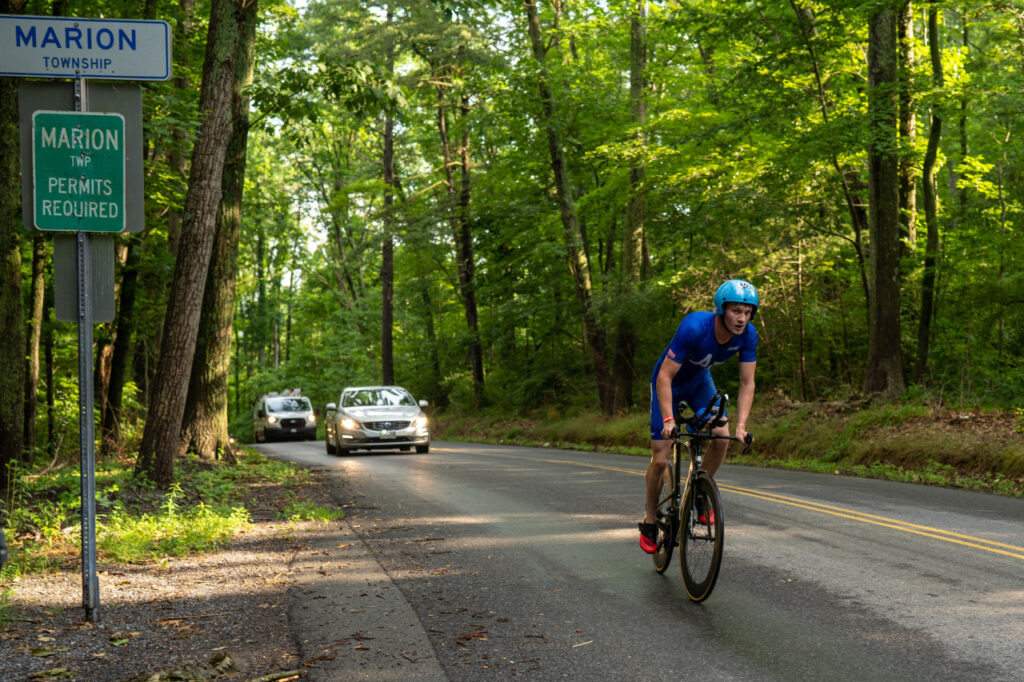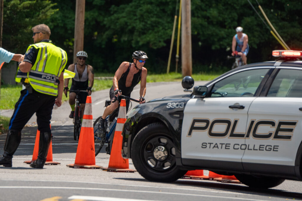 Mark Romano started the bicycle leg of the triathlon in the lead after being first out of the water at Sayers Lake. Photo by Greg GuiseThe 56-mile bike ride traveled through Hubler Ridge. Photos by Greg GuisePhoto by Greg GuiseCyclists traveled down Boalsburg Road into Lemont, where some residents were out to cheer them on. Photos by Greg GuiseAn Ironman 70.3 Pennsylvania Happy Valley competitor bicycles on South Atherton Street toward University Drive. Photo by Greg GuiseAthletes bike down University Drive as they make their way toward Beaver Stadium and the transition point to the run segment of the 2024 Ironman 70.3 Pennsylvania Happy Valley. Photo by Geoff Rushton | StateCollege.comThe run course took competitors along the campus side of College Avenue and up the Allen Mall. Photos by Geoff Rushton | StateCollege.comVolunteers give water to competitors on Curtin Road. Photo by Geoff Rushton | StateCollege.comRunners head past the Nittany Lion Shrine as they hit the homestretch of the Ironman 70.3 Pennsylvania Happy Valley. Photo by Geoff Rushton | StateCollege.comKiel Bur celebrates with his wife, Randi, after finishing first overall in the 2024 Ironman 70.3 Pennsylvania Happy Valley. Photos by Geoff Rushton | StateCollege.comEzra Swell took third place overall in the 2024 Ironman 70.3 Pennsylvania Happy Valley. Photo by Geoff Rushton | StateCollege.com
