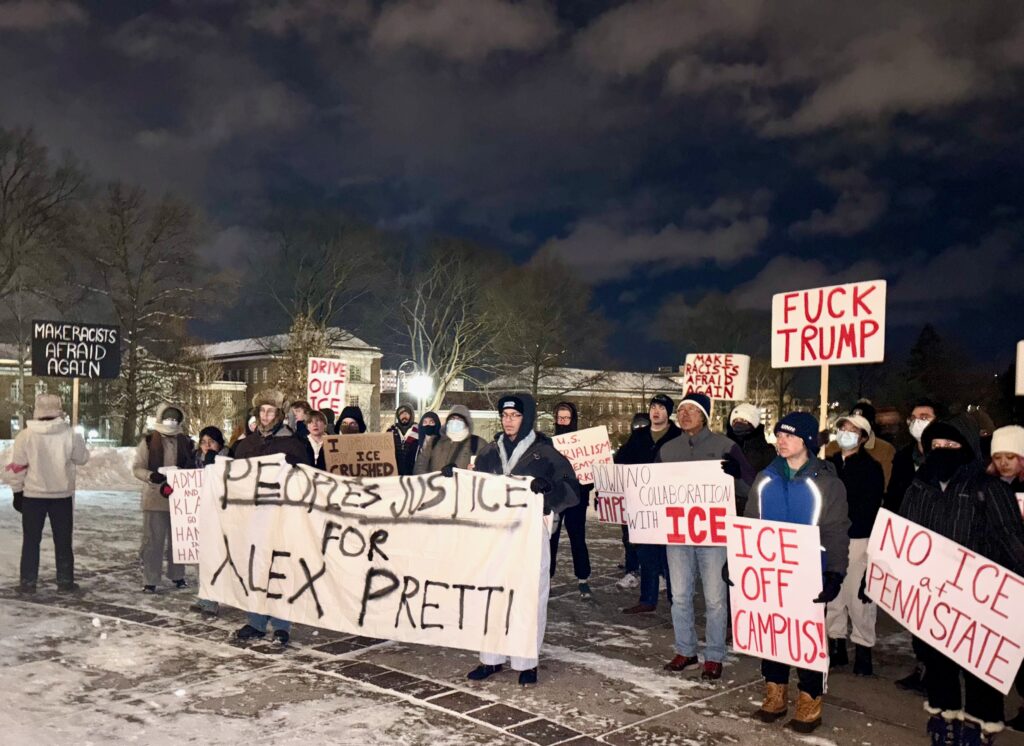 More than 100 people gathered Monday night in front of Penn State’s Old Main to protest Immigration and Customs Enforcement operations and demand accountability in the recent death of Alex Pretti, a Minneapolis man killed by federal agents earlier this week.