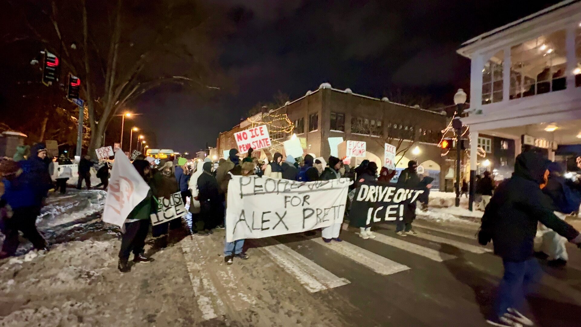 “I don’t know the last protest State College has had in this kind of weather, with people marching through snow and shutting things down,” one speaker said. “Carry the flame of Alex Pretti tonight. In honor of Alex Pretti and all other victims, we need to keep coming out here, but more importantly, we need to get organized.”