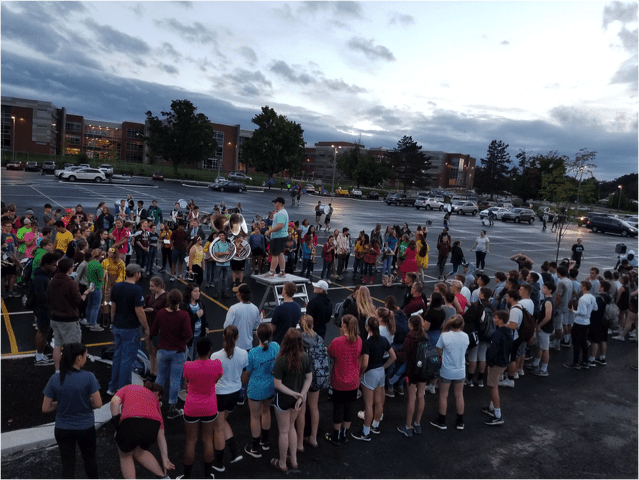 So that’s the “past” portion of the equation. The present is full of highly successful student-athletes on the field and in the classroom, and I’ll get to that shortly. But the “present” was never more on display then it was on Wednesday night, when nearly 100 student-athletes gathered to surprise our marching band at a practice, walking from the north gymnasium over to the adjacent parking lot to join the band. They delivered a message of appreciation and support to their peers, and at the close of their remarks, asked the band if they would play the alma mater. The band obliged, and within seconds you had a mass of student-athletes, spanning eight different sports, linking arms and enjoying a moment with their peers and classmates that brought to life much of what we hope to see from our students each and every day.