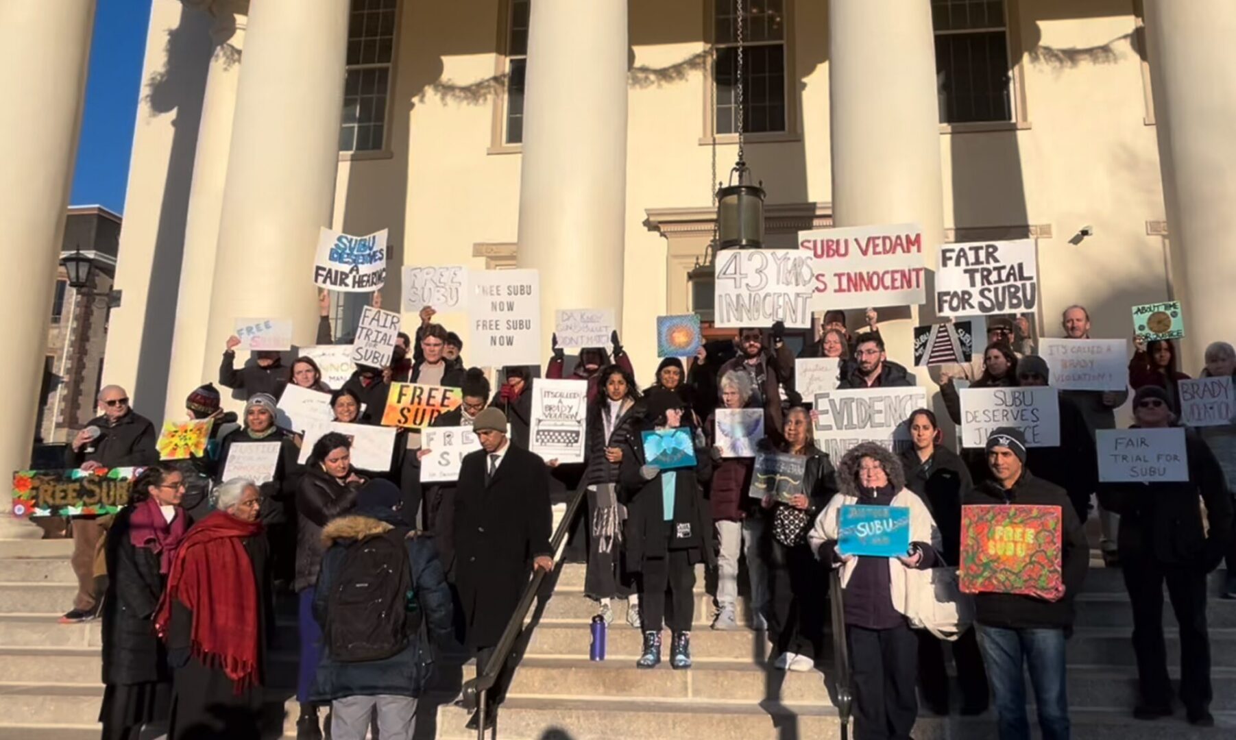 Supporters of Subu Vedam hold up signs outside the Centre County Courthouse on Friday, Feb. 7, 2025. Photo by Geoff Rushton | StateCollege.com