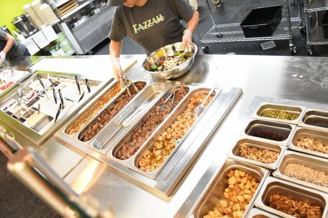 Or, at least, as still as the manager/part-owner of five restaurants and vice-president of a nationwide food company can be at 3 p.m. on a Wednesday afternoon. As we sit on the raised wooden benches of his latest venture, a juice and salad bar on East Calder Way called Tazzah, he pauses periodically to give employees directions, say hello to customers waiting in line, and answer phone calls.