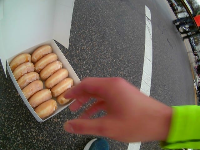 Shortly after the 2-mile mark is when the real challenge started. I was given a box of a dozen Krispy Kreme donuts and then jogged to the “eating area.” Unfortunately because it was cold, the glaze on the donuts was crusted over. These were a little more difficult to eat than the melt-in-your-mouth warm glazed donuts. The challenge was on!