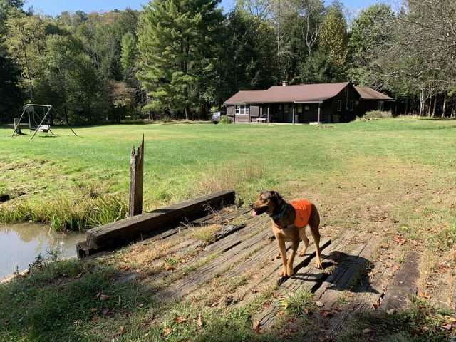 Last year was our dog Barkley’s first trip here but he was still a flight risk, so we kept him on his leash. On Saturday morning we “released the hound” and boy did he have a blast. He loved running through the creek stopping for an occasional drink of the cool natural water. I went on several long hikes with my dog. It was “me time” and a chance to gather my thoughts and to think about all the blessings in my life. Walking back toward the cabin I caught the smell of freshly cooked bacon and eggs compliments of my wife and our nephew Travis, who joined us from Pittsburgh.