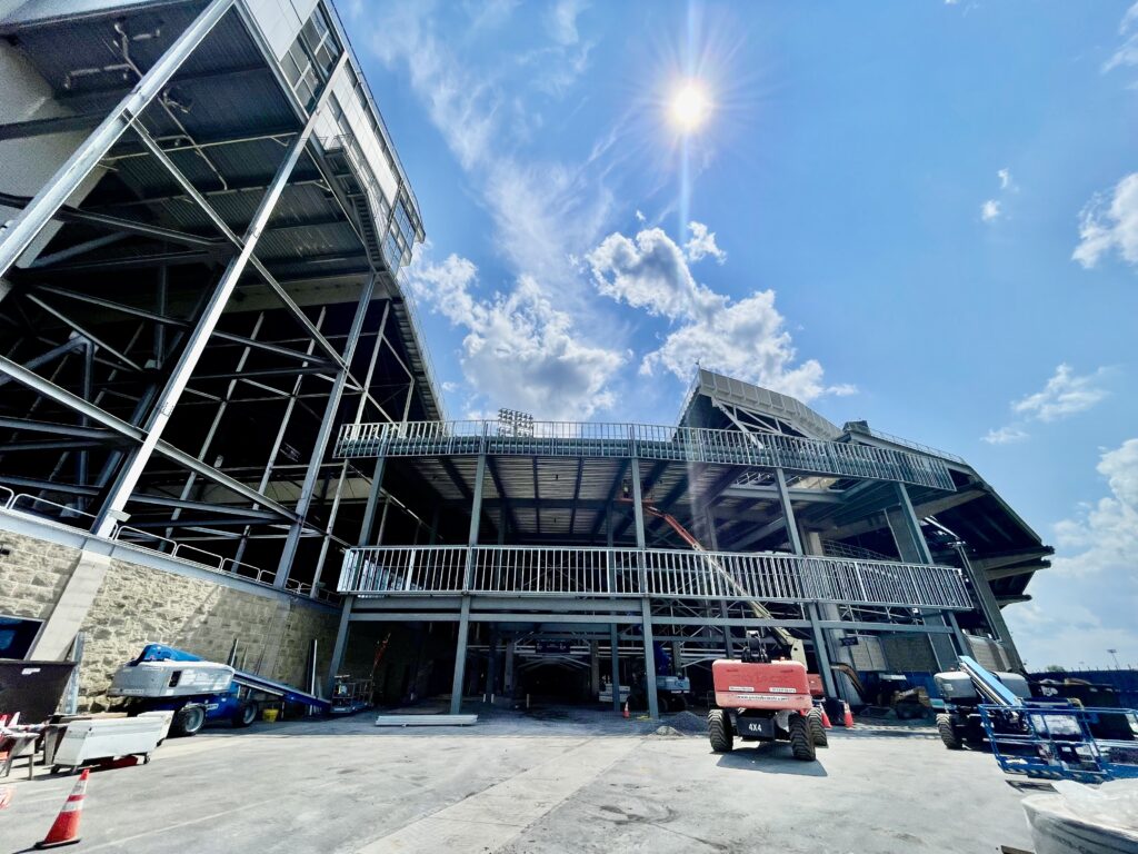It’s what they call a “super ribbon” scoreboard. Right now, cranes are on site to take down the old scoreboard, put in place new steel structures and reinforcements, and add a supporting catwalk, grating and access stairs.