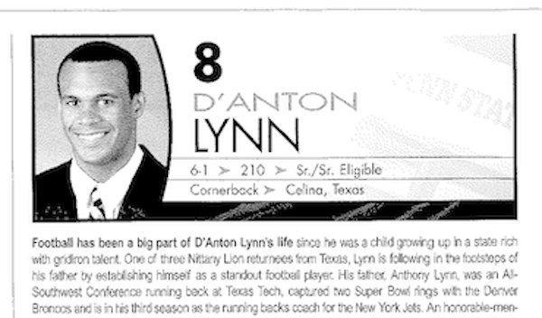 LYNN THE NITTANY LION: Lynn was a Penn State cornerback from 2008-11 (just missing Lucas, who was a PSU cornerback/safety from 2012-15). While at Penn State, Lynn was an ultra-steady leader, playing in 47 games. He saw considerable playing time as a freshman, then started every game as a sophomore and junior, and made 11 of 13 starts as a senior.