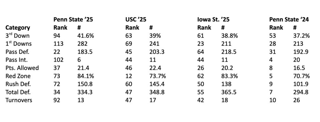 COMPARING DEFENSES: Here’s how the 2025 defenses of Penn State, Southern California and Iowa State stack up against each other, and compared to the Nittany Lions’ stellar defense of 2024, which was under the direction of then-defensive coordinator Tom Allen, who is now the DC at Clemson — Penn State’s opponent in the Pinstripe Bowl: