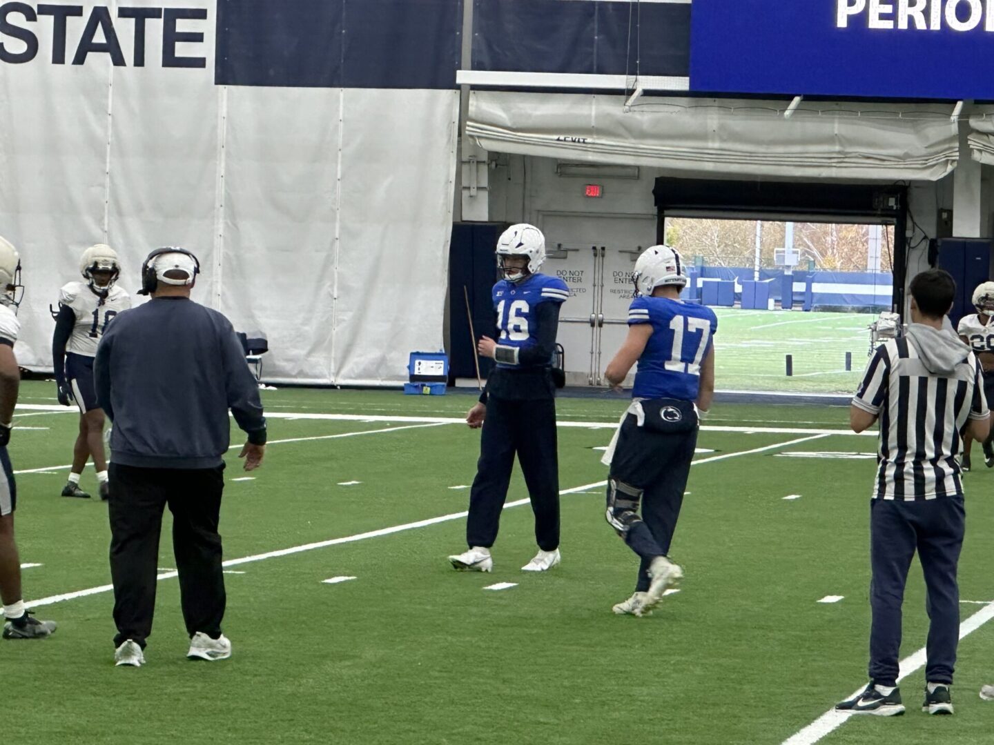 Kotelnicki, quarterbacks coach Danny O’Brien and assistant Trace McSorley, all wearing gameday headsets, were heavily involved with the unit and offered instructions as the quarterbacks worked with tight ends and wide receivers on short to intermediate routes.