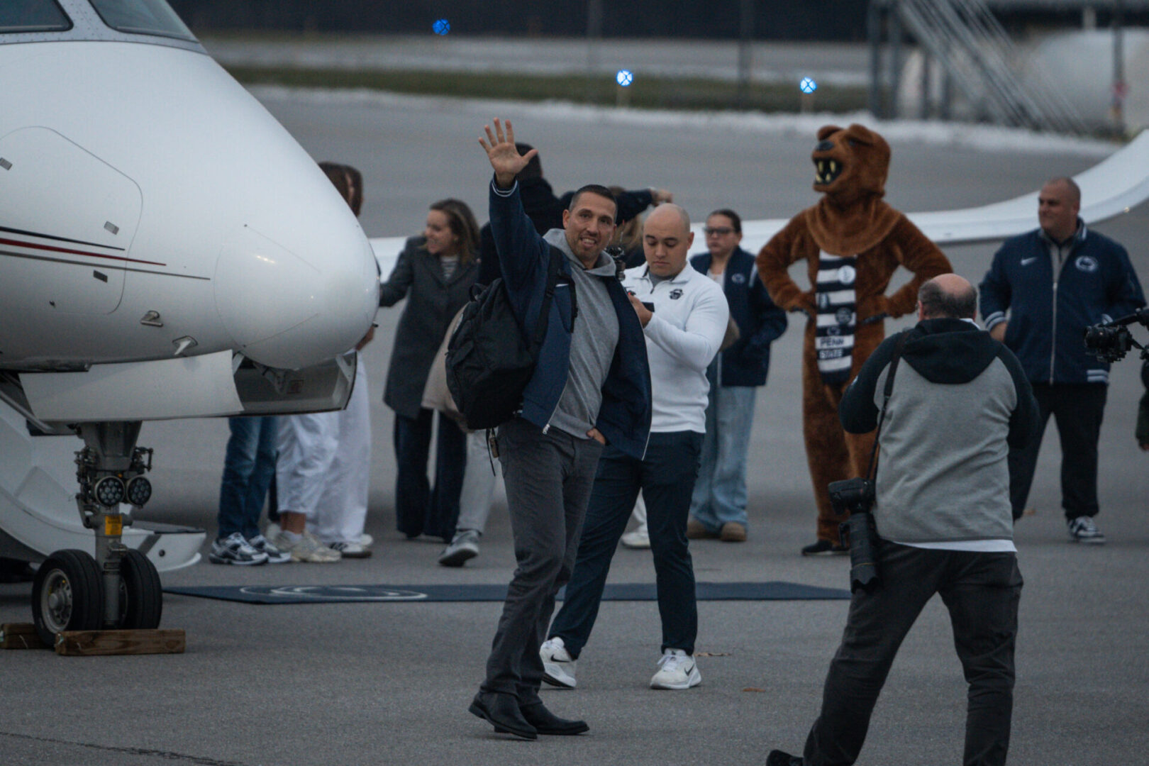 Which brings us to Sunday afternoon, as a crowd of over 150 fans watched Campbell’s arrival at the airport from behind a chain link fence. The very vocal group was a mixture of the most ardent Nittany Lions boosters — two-thirds were Penn State students and one-third were hardcore PSU fans who were most definitely card-carrying members of the AARP. The Nittany Lion mascot was there, plus several Penn State PR folks and athletics administrators.
