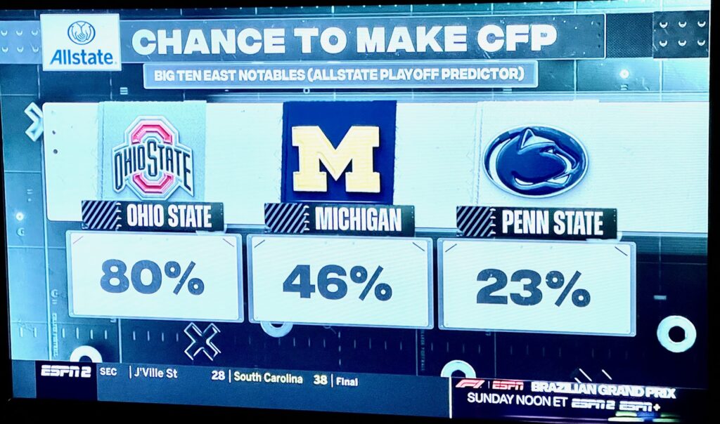 21. Round-robin play continues among the leaders in the Big Ten East. As it stands, Ohio State has the conference’s definitive lead in securing a berth in the final four-team College Football Playoff, according to ESPN. ESPN’s predictions assume, I assume: It’s a bit of a fait accompli that the Big Ten East champ beats the West champ. Ohio State beats Michigan. And Penn State loses to Michigan.