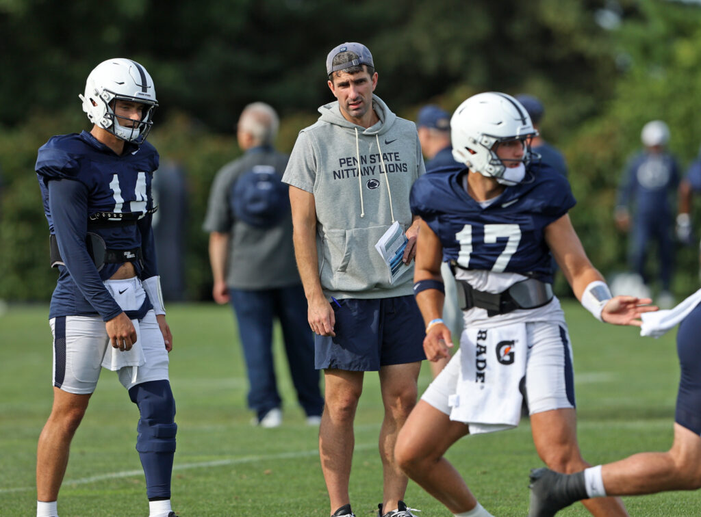 DANNY O’BRIEN, the quarterback coach, is with Grunkmeyer and Smolik every day, on and off the field. It’s a small QB room, with just five players. He knows them better than anyone on the staff. A former college quarterback, he was ACC freshman of the year when he played for Franklin (the OC) at Maryland. O’Brien is in his fifth year at PSU.