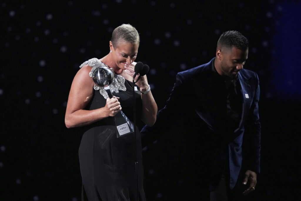 Penn State women’s volleyball coach Katie Schumacher-Cawley was met with a standing ovation as she took the stage Wednesday night at the Dolby Theater in Los Angeles to accept the Jimmy V Award for Perseverance during ESPN’s The ESPYS.