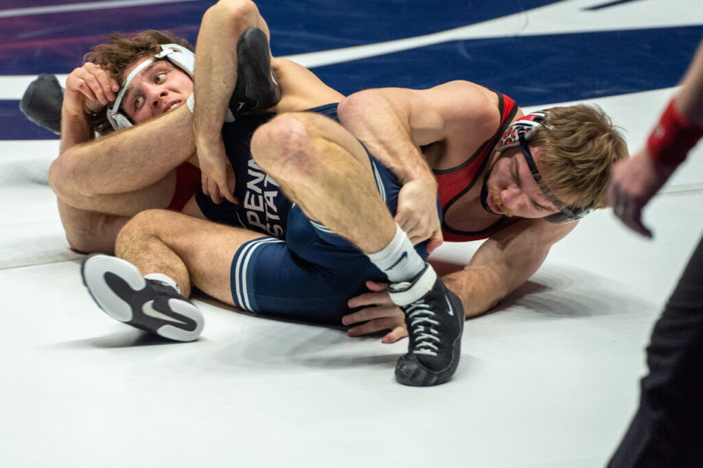 The meet got off to a wild start with No. 3 Braeden Davis taking on Ohio State’s Vincent Kilkeary. After a scoreless first period, Kilkeary escaped to open up the scoring in the second period, the Davis used a low shot to secure the match’s first takedown and take a 3-2 lead into the final two minutes. Kilkeary, aiming for a takedown, allowed Davis to escape to a 4-2 lead to start the period and a stall call against Davis narrowed his lead to 4-3 with under a minute left. Kilkeary appeared close to a takedown out of a scramble in the final seconds but no points were awarded, and a lengthy review confirmed the call on the mat to give the Nittany Lion freshman a 4-3 decision.