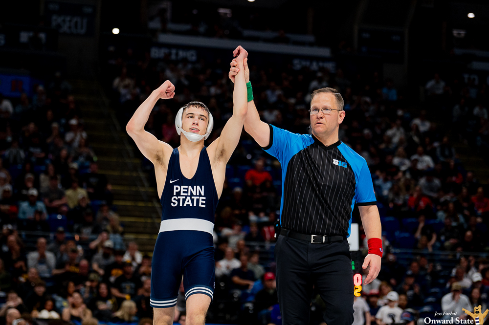 Top-seeded Luke Lilledahl used two takedowns and fended off a strong shot from No. 4 seed Jacob Moran of Indiana to take a 6-2 lead into the second period of their semifinal bout. Moran escaped to start the second, and late in the period Lilledahl battled hard at the edge of the mat to secure his third takedown and a 9-3 lead. Lilledahl escaped quickly to start the third, and though he couldn’t complete a late takedown attempt, the Nittany Lion added a riding time point for an 11-3 major decision.