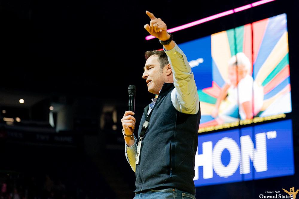 Nanes then led a chant that he created, asking the Bryce Jordan Center “Where do we dance?,” to which they replied, “City of THON.”