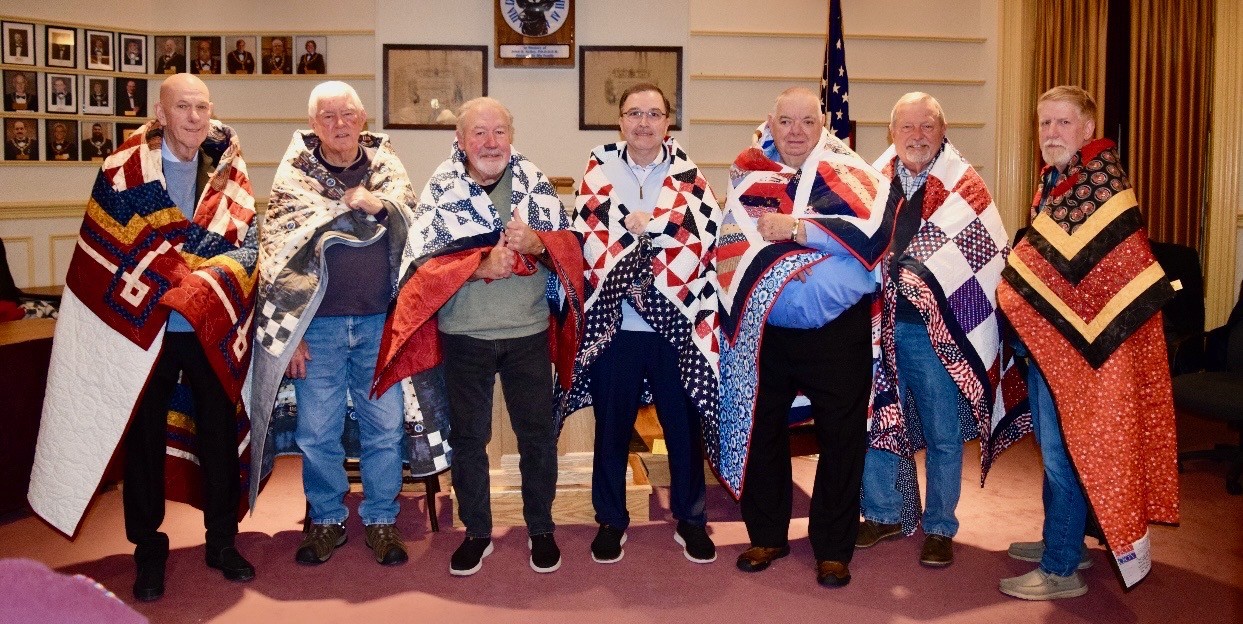 A Quilts of Valor Service was recently held at the Bellefonte Elks Club by a team from the Quilts of Valor Team of Central Pennsylvania, led by Team Leader Krista Gilday. Nine quilts that were all hand-quilted by the Quilts of Valor Team were presented, seven of which went to Elks members. Pictured from left are the seven Elks members, Kenneth Weaver, Larry Cramer, Steve McCulley, Darwin Light, Rick Hoffman, Dennis Reiter, and Ron Geyer (Philipsburg Lodge). Additional quilt presentations were made to John Curtin and Terry Runkle.