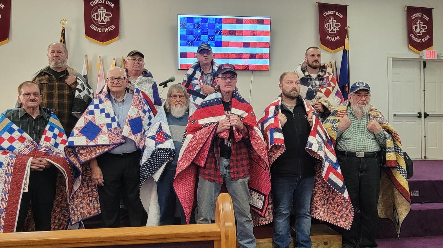 On Nov. 2, 2025, the Quilts of Valor presented 10 military Veterans with custom made quilts to honor their service and dedication to the nation. The Presentation occurred at Living Hope Alliance Church of Bellefonte. Pictured from left, front row, are Harold Rudy, James Schomer, Barry Dutrow, James McMullin, Andy Weaver, Robert Bloom; back row, James, Cox, Donald Hassinger, Steve Hassinger, Ernie Jenkins.