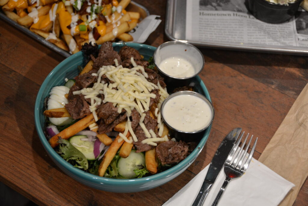 We also tried the cheesesteak (your choice of shaved rib-eye or chicken breast), served garden-style (onion, lettuce, tomato, and mayonnaise), loaded inside a toasted hoagie roll, and topped with melted cheese; the steak salad (prepared with spring mix, cucumbers, red onions, tomatoes, hard-boiled eggs, cheese, and fries and topped with juicy rib-eye steak), and the fried haddock with fries, a Friday special.